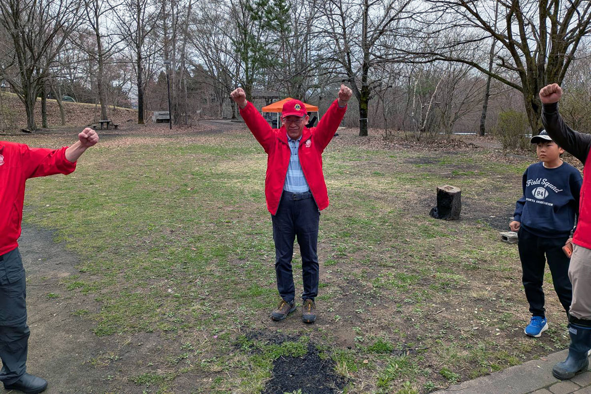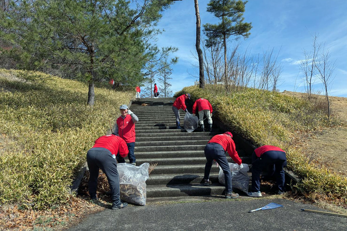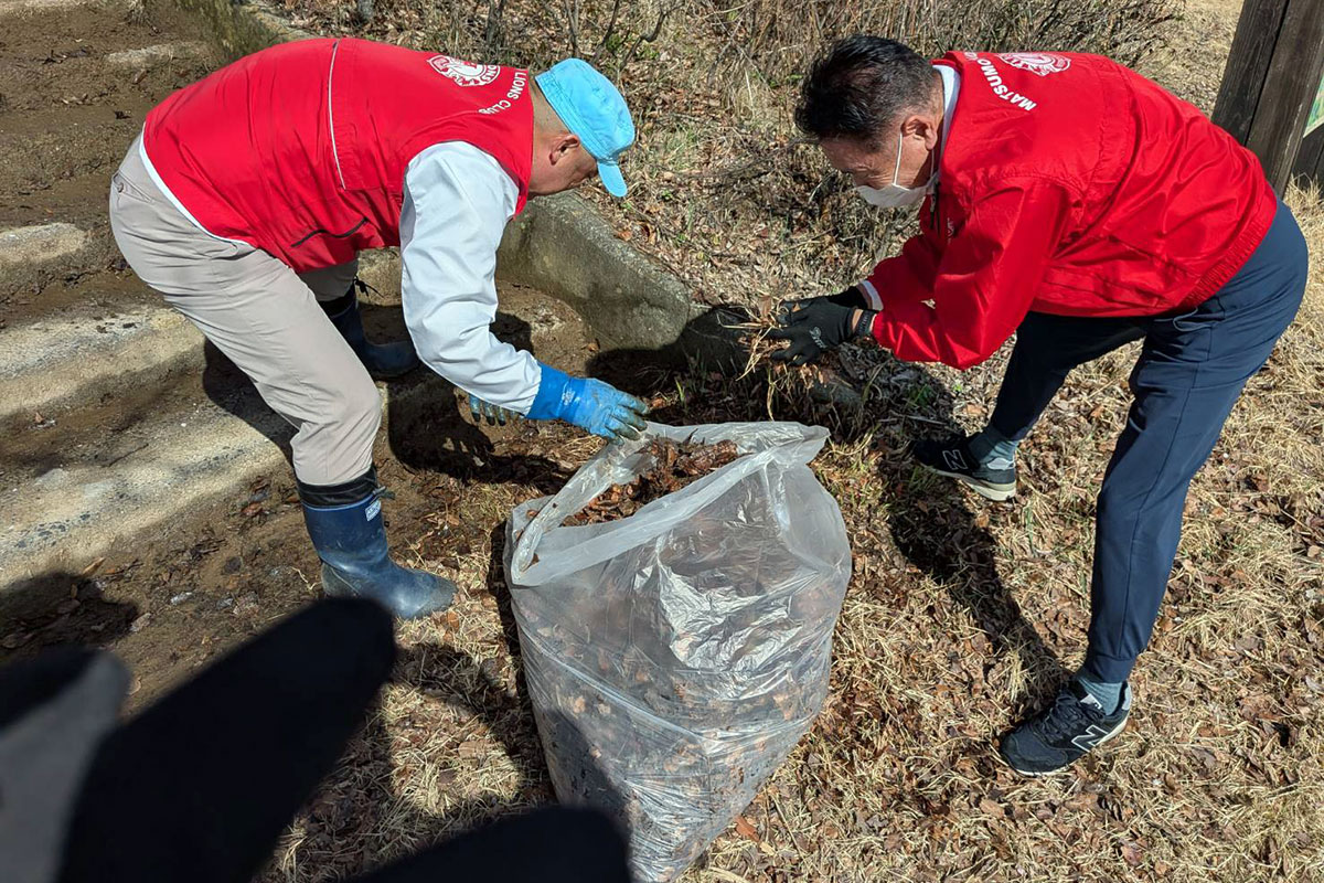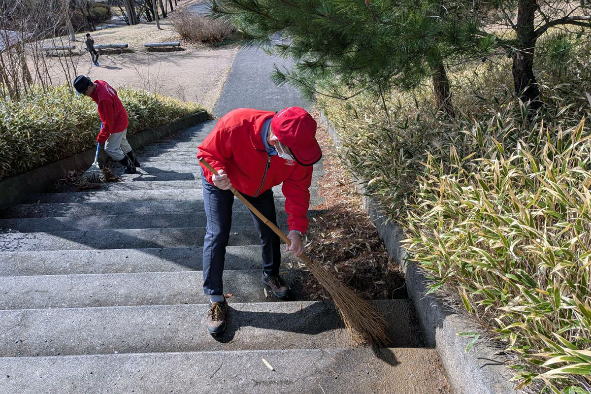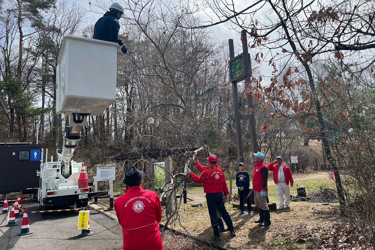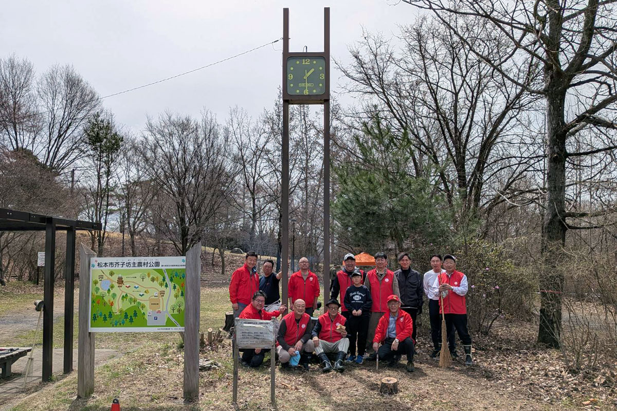 アルプス公園の植樹と清掃作業を終えてから、次は芥子坊主山公園に移動して、清掃作業を行いました。芥子坊主山公園には、当クラブが35周年記念事業にて「夢と希望の時計塔」を寄贈しました。時計塔に木の枝がかかったりしていたため、会長L.二木正樹の発案により今年度は芥子坊主山公園の清掃活動も行うことになりました。