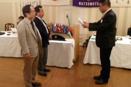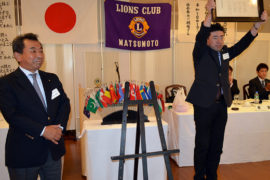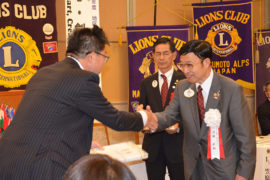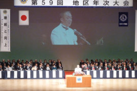 2013年9月17日 第1220回9月第二例会が、ホテルブエナビスタにて行われました。恒例となった「今月のお誕生日ライオン」。9月生まれのライオンで、幹事のL.濱、L.阿部、L.岩瀬(新入会員)が松倉...